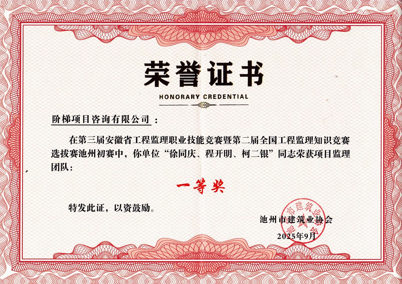 此次竞赛不仅是对我司监理团队专业能力的全面检验,更成为锤炼团队凝聚力、激发创新活力的重要契机。未来,工程监理与项目管理中心将以此次获奖为起点,持续深化“以赛促学、以学促干”机制,推动技术能力与团队协作双提升,为公司高质量发展筑牢人才根基,为行业进步贡献“匠心”力量!